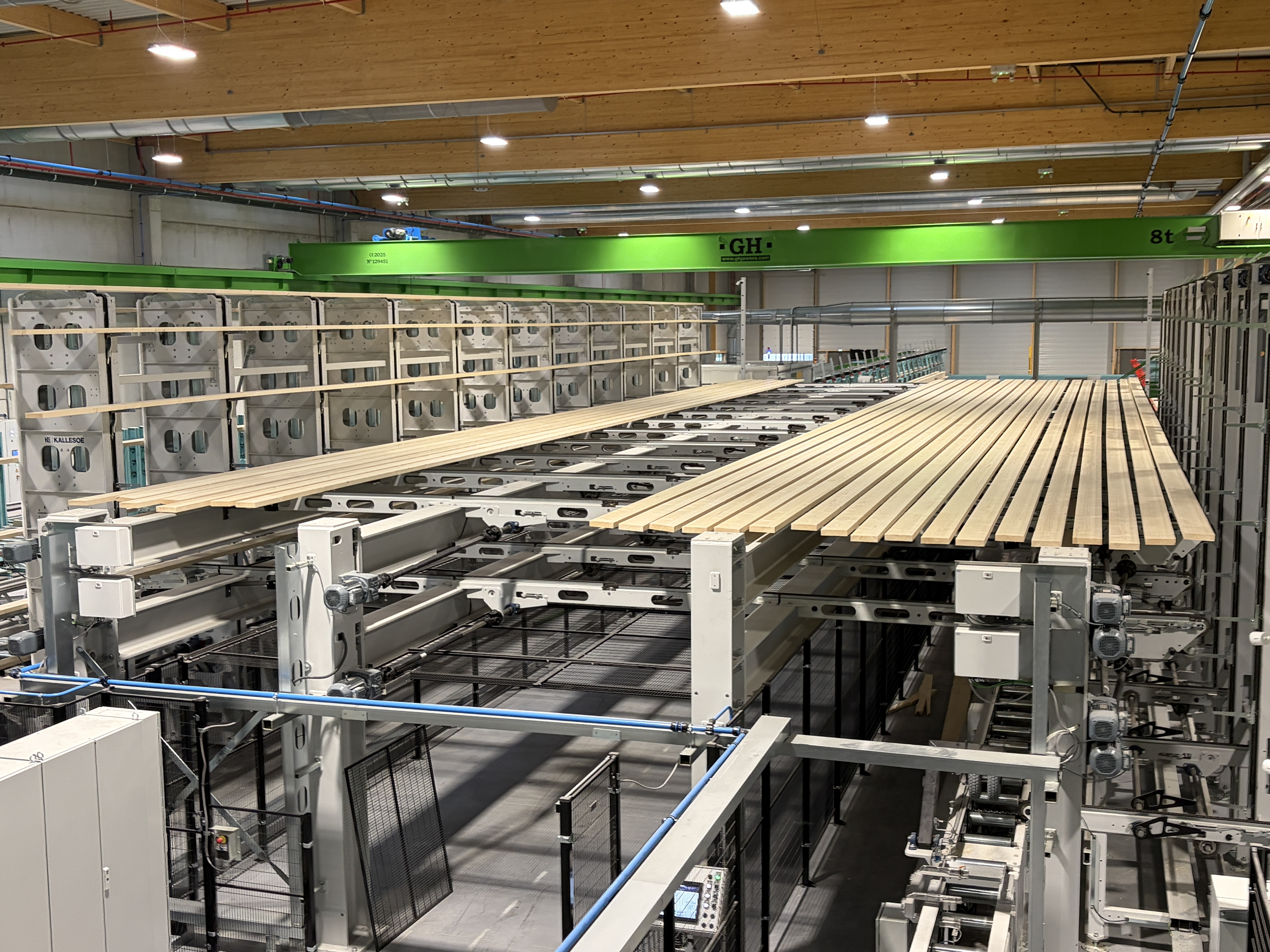 En amont de la ligne de presse, un scanner Microtec Goldeneye optimise le bois. Les lamelles aboutées se dirigent vers la ligne grande longueur ou vers la ligne Kallesoe moyenne longueur qui permet de faire des lamellés collés droits ou cambrés avec la presse HF Haute fréquence.
